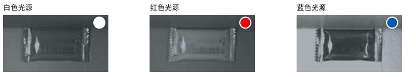 光源顏色對視覺檢測效果有什么影響呢?來看一個(gè)例子,將紅色的糖果包裝紙放入棕色紙盒中,圖中顯示了使用白色、紅色和藍(lán)色光源時(shí)各自的對比度水平。
