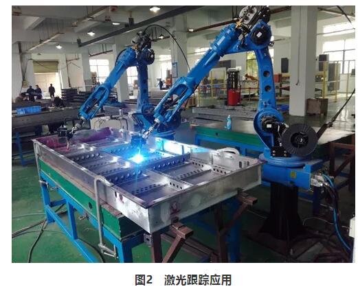 在實際自動焊接過程中,激光焊縫跟蹤器的作用是對焊縫做精確的定位。一個完整的焊縫檢測跟蹤系統(tǒng)通常由激光結(jié)構(gòu)光傳感器、控制器及執(zhí)行機(jī)構(gòu)組成,它們構(gòu)成了一個完整的閉環(huán)控制系統(tǒng),實現(xiàn)了檢測、計算和執(zhí)行的功能。在實際使用中執(zhí)行機(jī)構(gòu)有可能是由伺服電動機(jī)、直線導(dǎo)軌滑臺組成的焊接專機(jī),也可能是焊接機(jī)器人??刂破饕话銥楣た貦C(jī)或FPGA、DSP等嵌入式處理器。除此以外,一般還包括焊接電源、工裝夾具及上下料機(jī)構(gòu)等。機(jī)器人自動焊接工作站就是一種典型的應(yīng)用,首先通過視覺傳感器尋位確定工件及焊縫的位置,修正真實焊縫的焊接起始位置,在焊接過程中啟動實時跟蹤,通過實時的控制機(jī)器人不斷修正機(jī)器人的焊接軌跡,達(dá)到準(zhǔn)確的自動焊接(見圖2)。目前常用的跟蹤控制方式有無標(biāo)定的模糊跟蹤、標(biāo)定實時跟蹤、尋位及跟蹤+尋位方式。無標(biāo)定的模糊跟蹤不需要精確標(biāo)定實時檢測焊槍與焊縫的偏差,并實時地做趨勢微調(diào)控制。標(biāo)定實時跟蹤檢測的是焊縫的實際絕對位置,同時控制焊槍運動到焊縫的實際絕對位置。尋位方式指焊接時不實時跟蹤,在焊接前通過兩點或多點尋位確定當(dāng)前焊縫或工件的位置,提前修改執(zhí)行機(jī)構(gòu)的運動軌跡,從而實現(xiàn)精確的焊接。跟蹤+尋位方式則是標(biāo)定實時跟蹤與尋位方式的結(jié)合。
