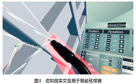 (3)虛擬現(xiàn)實仿真與人機(jī)交互技術(shù)。在目前的智能化焊接中,技術(shù)人員通過Unity3D在虛擬仿真與人機(jī)交互技術(shù)實現(xiàn)了虛擬現(xiàn)實交互的焊接(見圖3)。人機(jī)交互界面負(fù)責(zé)機(jī)器人運動信息反饋和機(jī)器人的控制,人再通過人機(jī)交互界面對焊接機(jī)器人實施遠(yuǎn)端操作,從而達(dá)到人機(jī)交互,在一定程度上可以替代示教編程及離線編程。在復(fù)雜、惡劣的環(huán)境中將遠(yuǎn)端焊接機(jī)器人與虛擬現(xiàn)實結(jié)合起來并實施人機(jī)交互,既能保證焊接工人的安全又能高效地完成焊接作業(yè)。