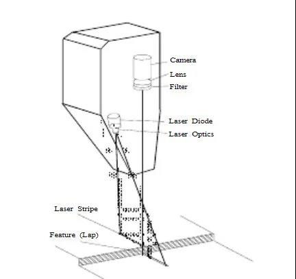 焊接跟蹤傳感器頭部包括一個CCD攝像機和一個或兩個半導體激光器。激光器作為結(jié)構(gòu)光源,以預(yù)定的角度將激光條紋投影到傳感器下部的工件表面。攝像機直接觀察在傳感器下部的條紋。攝像機前部是一個光學濾光片,允許激光通過但是濾去所有其他的光,例如焊接電弧。傳感器因此能夠非常接近焊接電弧。