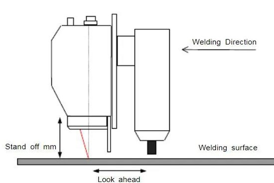 傳感器通常以預(yù)先設(shè)定的距離(超前)安裝在焊槍前部,因此它可以觀察焊縫。傳感器本體到工件的距離也就是安裝高度取決于所安裝的傳感器型號。當焊槍在焊縫上方正確的定位后,焊縫應(yīng)該接近條紋的中心,這才能使得攝像機觀察到激光條紋和焊縫。