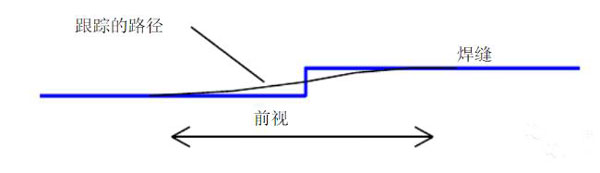 從攝像機觀察到的圖像被控制器處理,圖像首先被獲取并形成數(shù)字化的激光條紋圖像。然后軟件使用特定的設(shè)置來將條紋分成形成焊縫的許多條線。從這些線的位置,系統(tǒng)可以測量焊縫的位置,并將其轉(zhuǎn)化成以mm計算的距離。這種轉(zhuǎn)化是使用在傳感頭中存儲的校準數(shù)據(jù)完成的。當系統(tǒng)正在進行跟蹤時,焊接速度和前視距離被用來計算延遲時間。這就保證焊槍而不是傳感器沿著焊縫行進。應(yīng)該指出的是控制策略提供了平滑的前視距離以保證形成平滑的焊縫。因此如果傳感器在路徑上遇到了一個臺階的變化,他將會提供一個平滑的響應(yīng),如下圖所示。